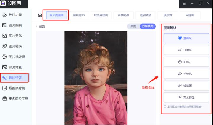 点进去之后可以看到他自动跳转到【趣味特效】功能上,其实两个都是一样的~上传自己想要的图片后选择喜欢的风格即可进行变换!!让我最最最心动的就是漫画风格居然有那么多种选择!