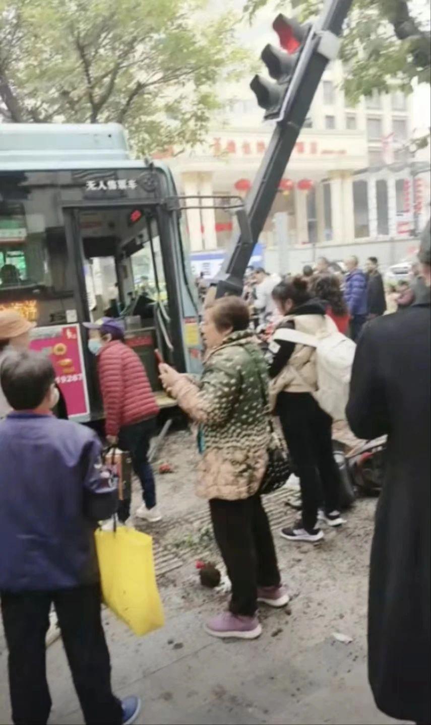 据网友发布的视频显示,一公交车车头撞上红绿灯信号杆,一辆摩托车倒在旁边,现场多人围观。