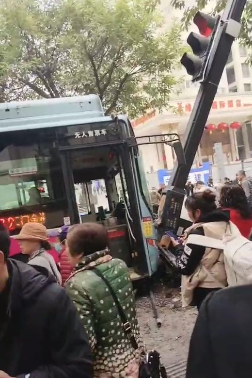 2 月 20 日,重庆渝中区解放西路,有网友爆料称一公交车发生意外事故,撞到红路灯信号杆上。