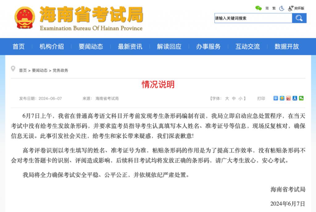 6 月 7 日上午,海南省在普通高考语文科目开考前发现考生条形码编制有误,海南省考试局立即启动应急处置程序,在当天考试中没有给考生发放条形码,并要求监考员指导考生认真填写本人姓名、准考证号等信息,现场反复核对,确保信息无误。此事引发社会关注,给考生和家长带来疑惑,我们深表歉意!