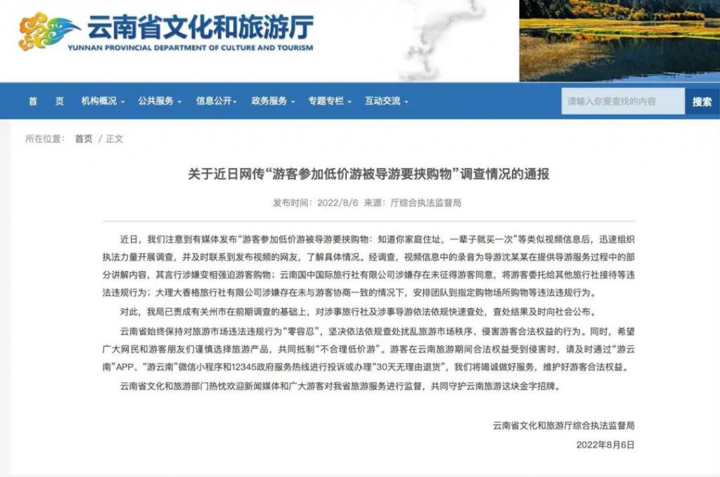 据云南省文化和旅游厅综合执法监督局 8 月 6 日通报称,近日,有媒体发布 " 游客参加低价游被导游要挟购物:知道你家庭住址,一辈子就买一次 " 等类似视频信息后,迅速组织执法力量开展调查,并及时联系到发布视频的网友,了解具体情况。