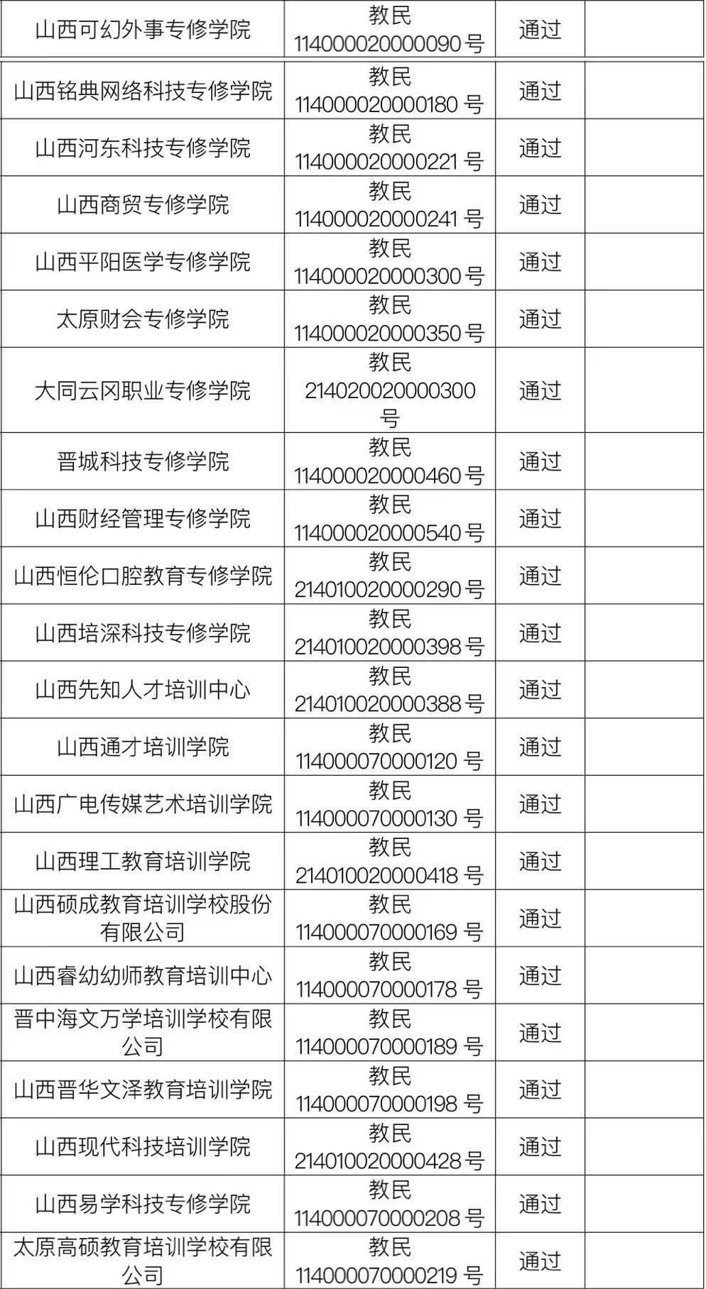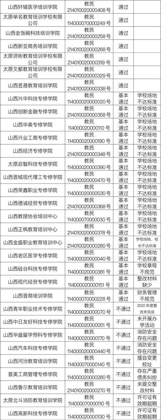 基本通过,学校场地不达标准:山西兴华科技专修学院、山西创新金融专修学院、山西华美专修学院、山西兴业工商专修学院、山西经济专修学院、太原启智科技专修学院、山西晋城现代理工专修学院、山西荣鑫职业专修学院、山西德诚经贸专修学院、山西教授协会培训中心、山西正枫教育培训中心、山西老区医学专修学院。