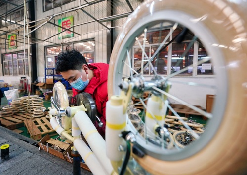 12月27日,河北省平乡县一家自行车、童车生产企业的员工在检查轮胎质量。 新华社记者 牟宇 摄
