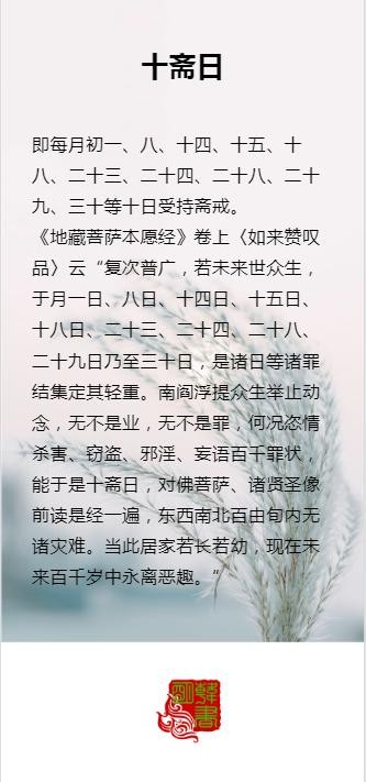 即每月初一、八、十四、十五、十八、二十三、二十四、二十八、二十九、三十等十日受持斋戒。《地藏菩萨本愿经》卷上〈如来赞叹品〉云“复次普广,若未来世众生,于月一日、八日、十四日、十五日、十八日、二十三、二十四、二十八、二十九日乃至三十日,是诸日等诸罪结集定其轻重。南阎浮提众生举止动念,无不是业,无不是罪,何况恣情杀害、窃盗、邪淫、妄语百千罪状,能于是十斋日,对佛菩萨、诸贤圣像前读是经一遍,东西南北百由旬内无诸灾难。当此居家若长若幼,现在未来百千岁中永离恶趣。”