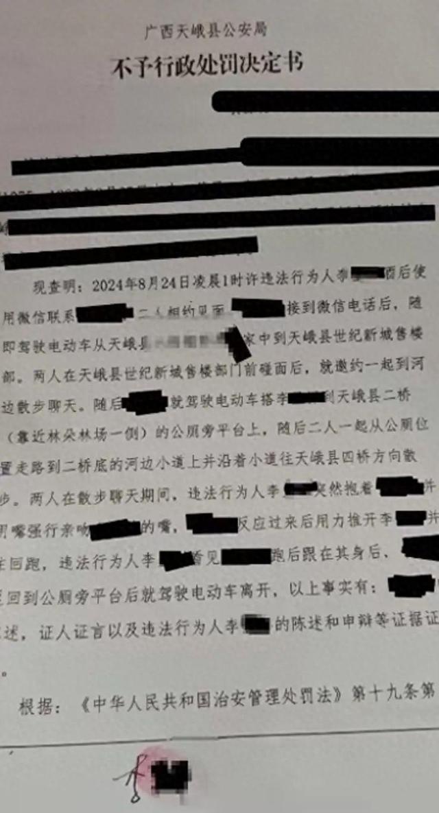 该网友发布了一份天峨县公安局的不予行政处罚决定书,上面载明,现查明 2024 年 8 月 24 日凌晨 1 时许违法行为人李某某酒后使用微信联系某某,二人相约见面。某某接到微信电话后,随即驾驶电动车从家中到天峨县世纪新城售楼部门前碰面后,就邀约一起到河边散步聊天……二人一起从公厕位置走路到二桥底的河边小道上,并沿着小道往天峨县四桥方向散步。两人在散步聊天期间,违法行为人李某某突然抱着某某,并用嘴强行亲吻某某的嘴,某某反应过来后用力推开李某某并往回跑,违法行为人李某某看见某某跑后跟在其身后,某某回到公厕旁平台后就驾驶电动车离开。