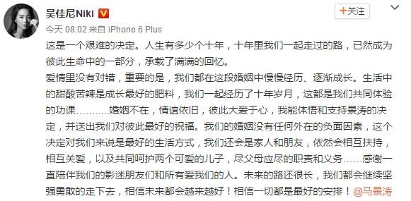 今日,吴佳尼终于发声,表示离婚是一个艰难的决定。同时“我们的婚姻没有任何外在的负面因素,这个决定对我们来说是最好的生活方式,我们还会是家人和朋友,依然会相互扶持,相互关爱,以及共同呵护两个可爱的儿子,尽父母应尽的职责和义务”。