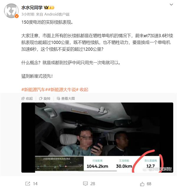 博主表示,市面上所有的长续航车型都是牺牲了个驱动电机而达成,但蔚来蔚来 ET7 150 度电池版,双电机零百加速 3.6 秒,续航表现也能超过 1000 公里,既不牺牲续航,也不牺牲动力。