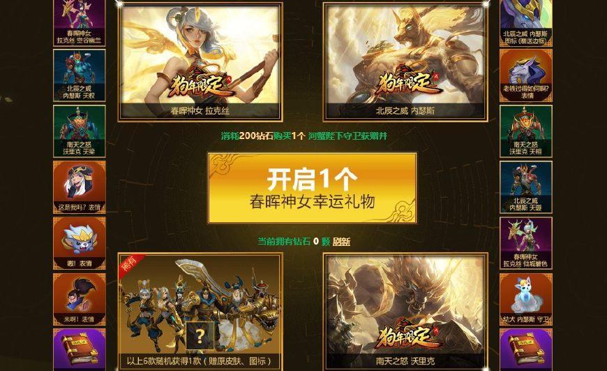 这次活动分为3个小活动,我们先说下第一个抽奖活动,和上次冰雪节皮肤一样,奖励是固定的,抽到一个之后会自动消掉,下次就抽不到了。当然了,狗年限定皮肤都在奖池之内,这也要看大家的运气了。
