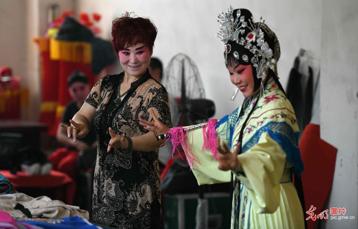 2025年8月22日,在河北石家庄深泽县石油俱乐部,深泽坠子剧团演员在后台做准备。深泽坠子,始称"化妆坠子",是河北省稀有地方剧种,广泛流传于河北省中南部地区。2008年深泽坠子被列入第二批国家级非物质文化遗产名录。(陈其保摄/光明图片)