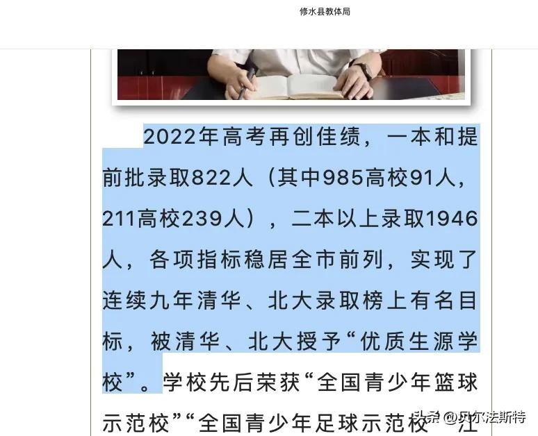2025年修水一中高考再创佳绩,一本和提前批录取822人(其中985高校91人,211高校239人),二本以上录取1946人,各项指标稳居全市前列,实现了连续九年清华、北大录取榜上有名目标,被清华、北大授予“优质生源学校”。