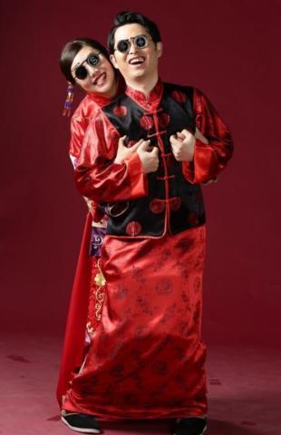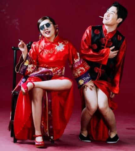 纪敏佳的结婚照感觉有点搞怪哦。两个人的性感感觉换了过来,这种放浪不羁的结婚照真要给个好评~