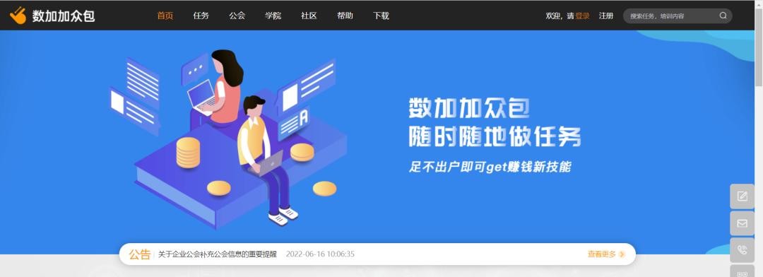数加加众包是一家在线提供数据采集及数据标注的众包任务平台。需要兼职者有充足的业余时间,又具备熟练的计算机或手机操作技能。兼职者也可在数加加创建公会,享受更多额外福利。