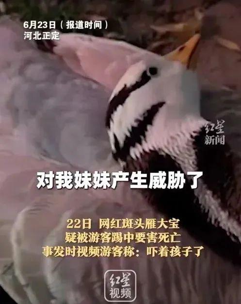 据悉,这只大雁名叫 " 大宝 "。一直更新大宝动态的发布者 " 斑头雁大宝 " 在 22 日宣布大宝离世,称 " 游客的一脚踢中了要害,感谢同学深夜对大宝的抢救,也感谢园区的支持。他还称自己从派出所出来,因为保护大宝给了游客一拳,可能会被定性成打人。"