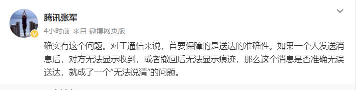 张军表示:对于通信来说,首要保障的是送达的准确性。如果一个人发送消息后,对方无法显示收到,或者撤回后无法显示痕迹,那么这个消息是否准确无误送达,就成了一个 " 无法说清 " 的问题。