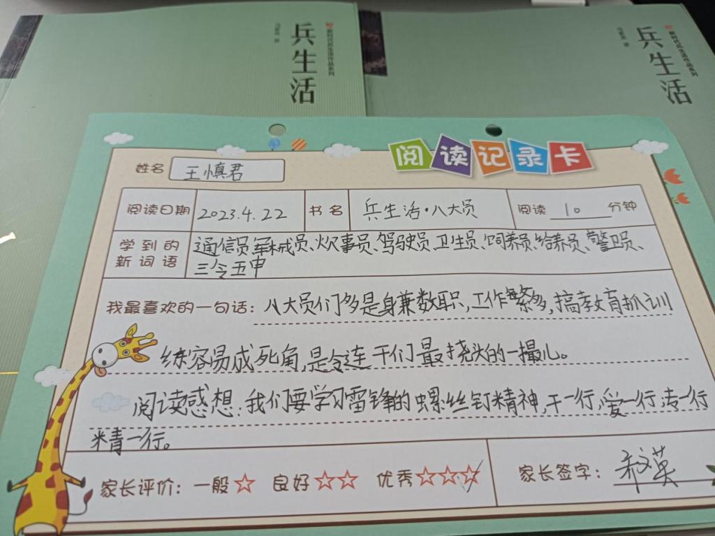黄教官生动有趣的讲述点燃了望城 " 雷小锋 " 的当兵从军梦,大家纷纷举手表示长大了要当兵报效祖国。事后,孩子们纷纷写下了《兵生活》的阅读感想,来自周南望城学校 046418 编号雷小锋王慎君写下了阅读感想:" 我们要学习雷锋的螺丝钉精神,干一行、爱一行、专一行、精一行。"