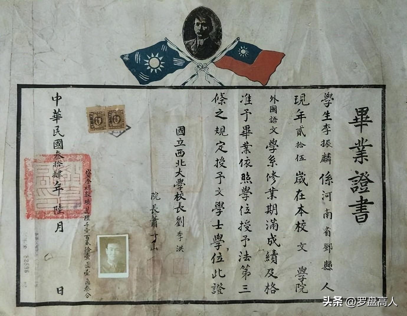 1945年,国立西北大学校长刘季洪、院长萧一山签发的毕业证书