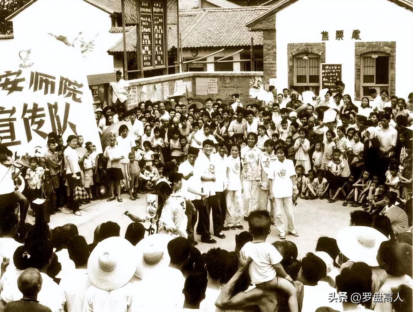 1958年6月,西安师范学院文艺宣传队在西安市东大街宣传党的过渡时期总路线