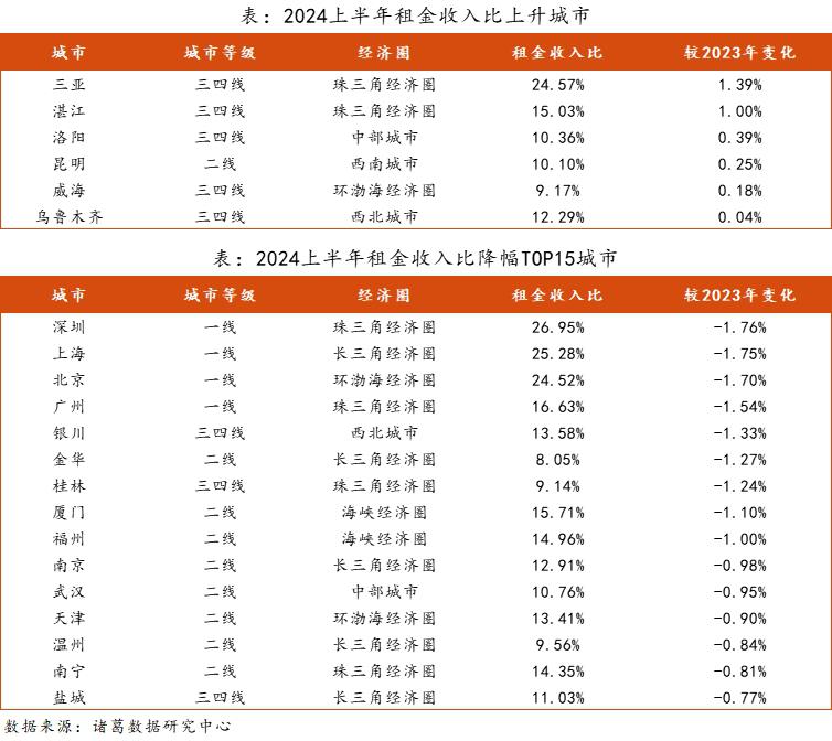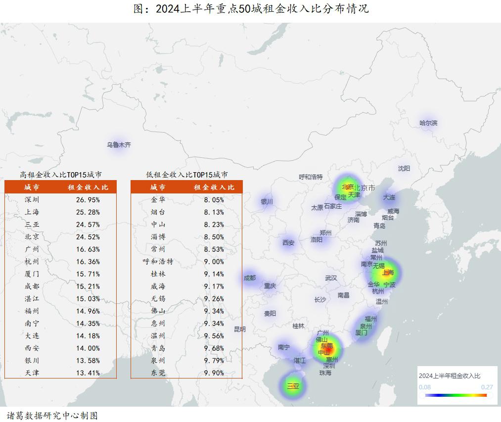 2024 年上半年,国内租房支出压力最大的 4 个城市分别为:深圳、上海、三亚、北京,它们的租金收入比均超过 20%,但不超过 30%。