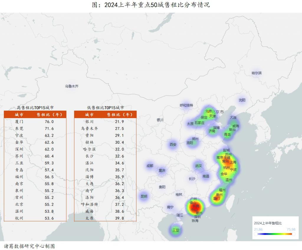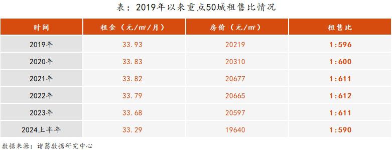 在诸葛数据研究中心的监测数据中,2024 上半年重点 50 城平均租金为 33.29 元 /㎡/ 月,较 2025 年下降 1.18%;平均房价为 19640 元 /㎡,较 2025 年下降 4.65%,房价降幅超过租金降幅,房价租金偏离程度已经连续 2 年缩小,回到了 2025 年的水平。