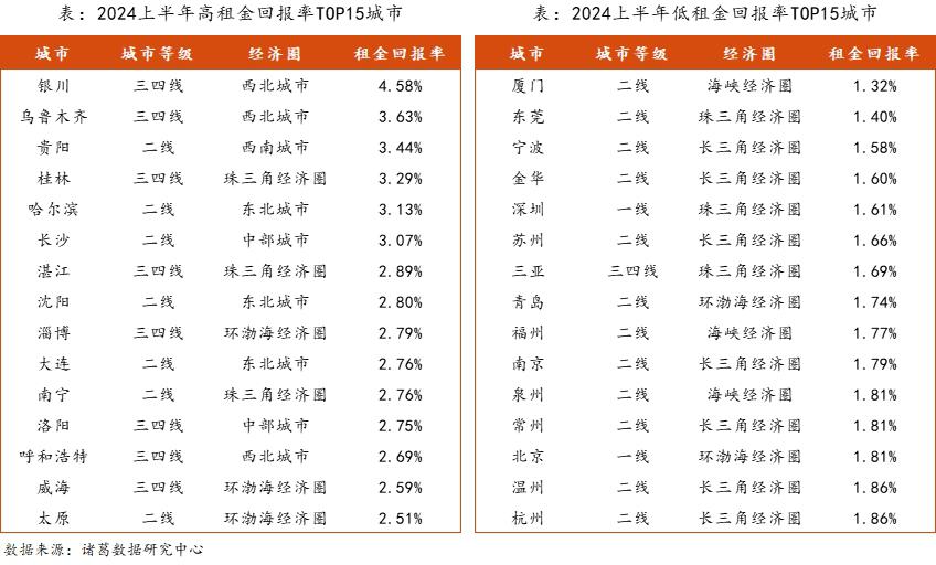 据诸葛数据研究中心统计,2024 年上半年,一线城市租金回报率出现小幅下降,二线、三四线的租金回报率更高。分等级城市来看,2024 上半年一线城市租金回报率为 1.79%,较 2025 年回落约 0.01 个百分点;二线城市租金回报率为 1.92%,较 2025 年上升 0.09 个百分点;三四线城市租金回报率为 2.46%,较 2025 年上升 0.12 个百分点。