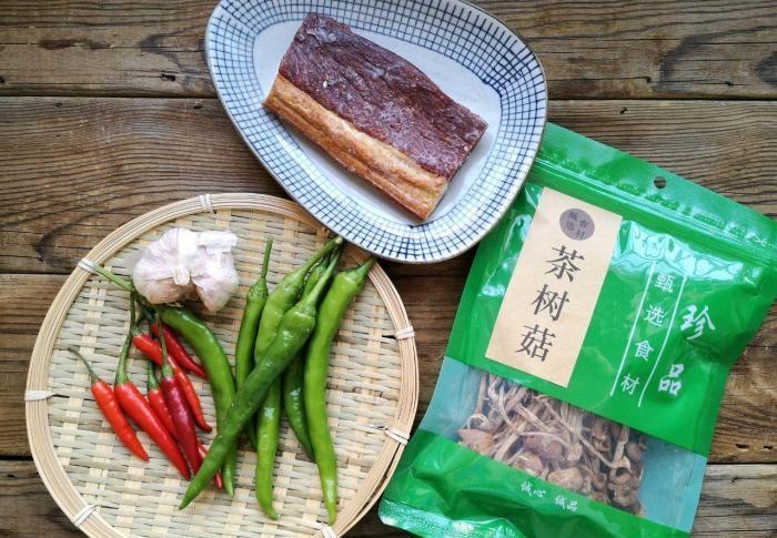 配料:茶树菇75克,腊肉100克,二荆条6个,小米辣6个,蒜3瓣,味极鲜酱油15克,蚝油15克。