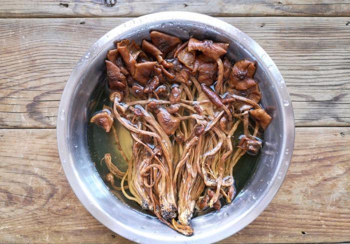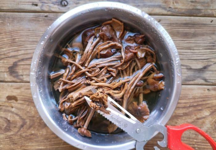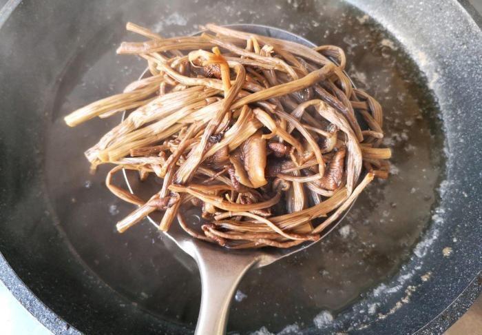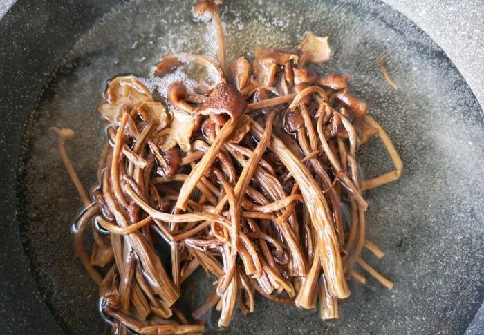 步骤三:起锅烧水,水开之后把茶树菇放到锅中煮三分钟的时间,煮好之后把茶树菇的水分给充分地控干。