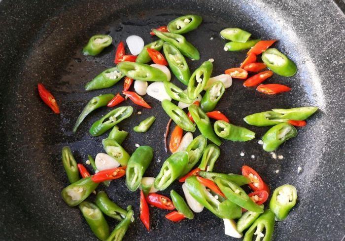 步骤五:重新起锅烧油,油热之后把二荆条、小米辣放到锅中开始炒炒到断生。