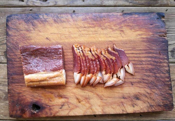 步骤二:浸泡好的茶树菇要想先把根部煎掉,然后把腊肉切成比较大的块,二荆条等食材也都是要先给切好备用。