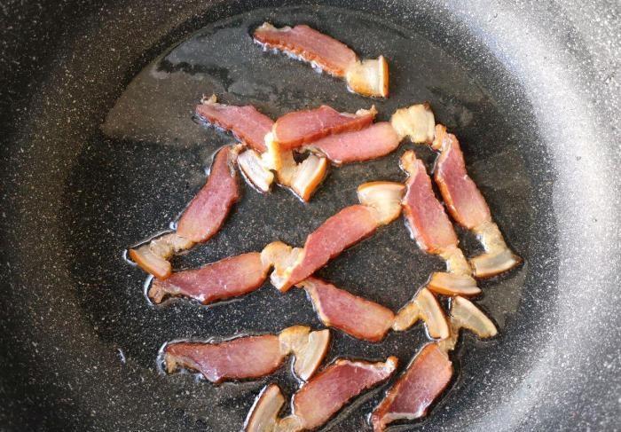 步骤四:另外起锅烧油,然后把腊肉放到锅中开始炒,要把腊肉给炒到肉色透明的状态,这个时候说明腊肉的油脂被充分地炒出来了。然后把焯水后的茶树菇给放到锅中开始炒,均匀地翻炒到位之后捞出备用。