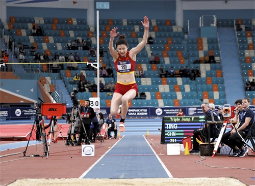 当日,在哈萨克斯坦首都阿斯塔纳举行的2023亚洲室内田径锦标赛女子三级跳远比赛中,中国选手陈婷以13米52的成绩摘得铜牌。
