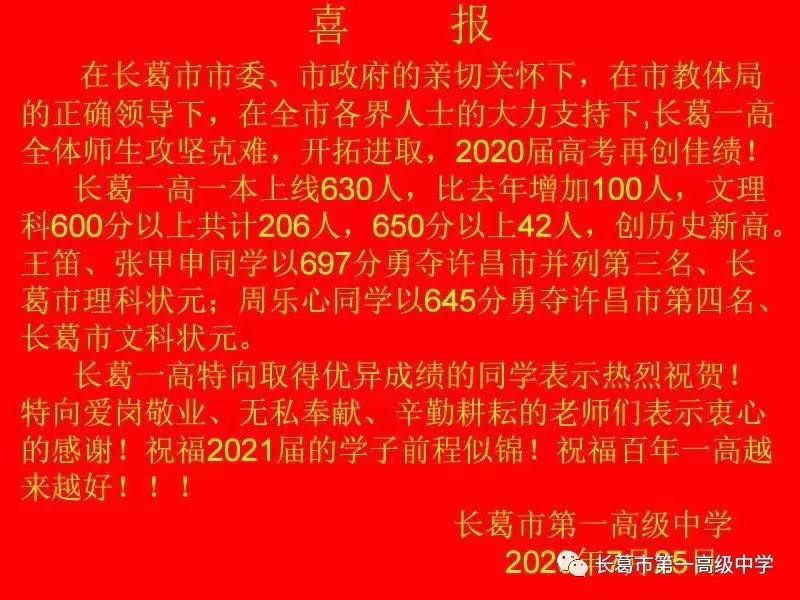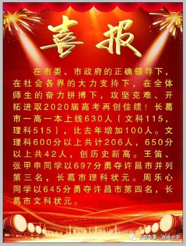 长葛市一高一本上线630人(文科115,理科515),比去年增加100人。文理科600分以上共计206人,650分以上共42人,创历史新高。王迪、张甲申同学以697分勇夺许昌市并列第三名,长葛市理科状元。周乐心同学以645分勇夺许昌市第四名,长葛市文科状元。
