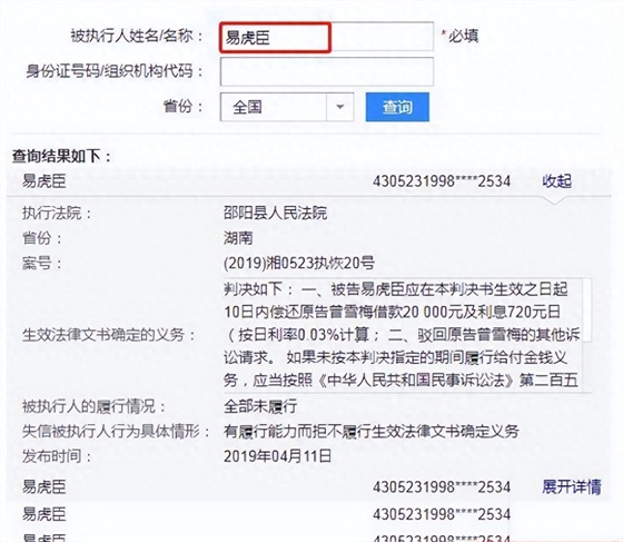 易虎臣被法院列为了“老赖”,因为欠大批粉丝的钱不还。