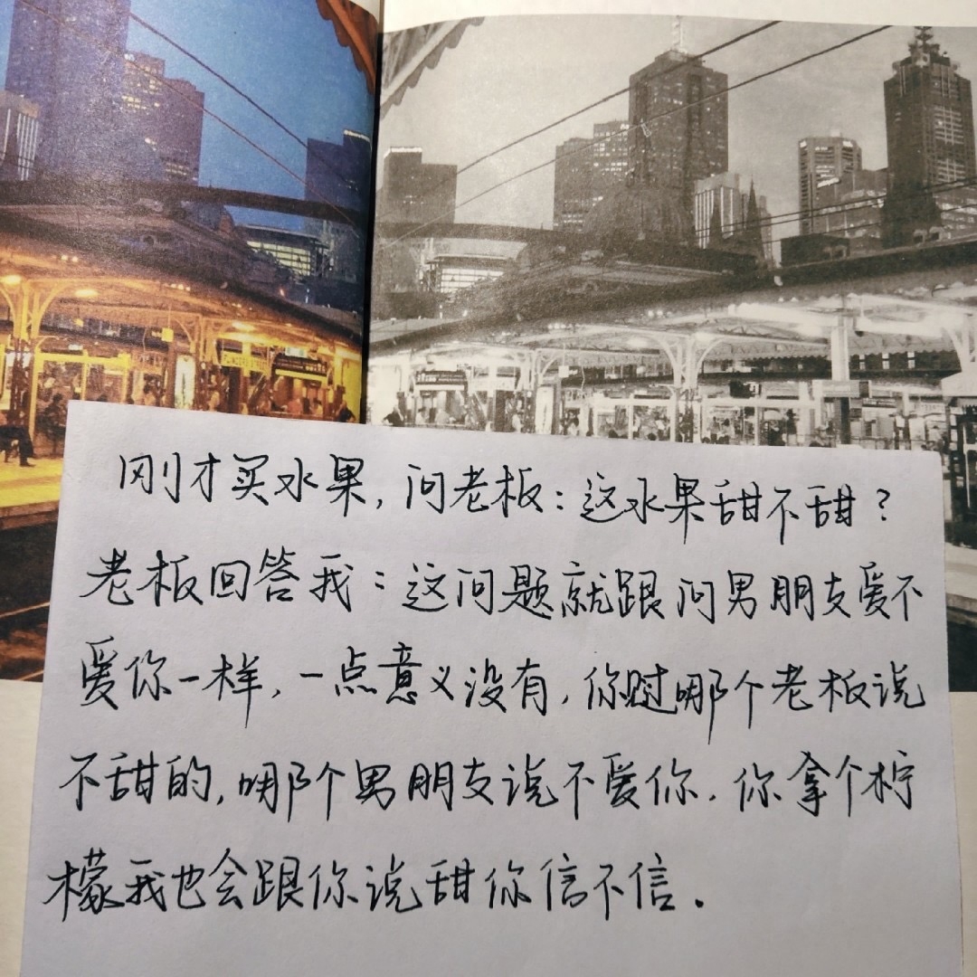 1、刚才买水果,问老板:这水果甜不甜?老板回答我:这问题就跟问男朋友爱不爱你一样,一点意义没有,你见过哪个老板说不甜的,哪个男朋友说不爱你,你拿个柠檬我也会跟你说甜,你信不信