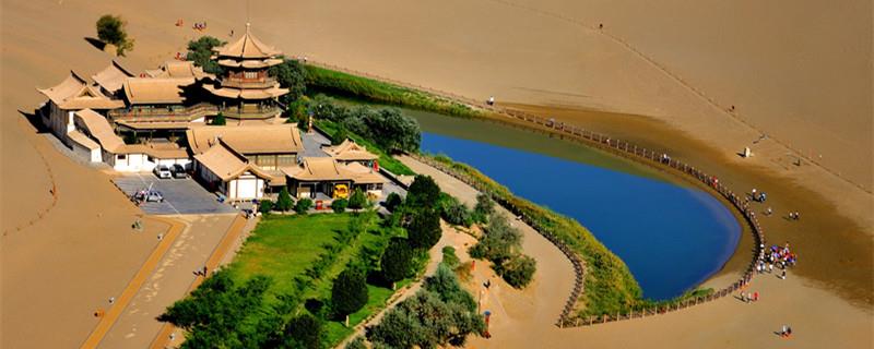 月牙泉的周围是高高的沙山,中间有一个形似月牙的小湖。鸣沙山在晴天或有人从山上滑下时会发出声响,所以叫鸣沙山,这里还有一个奇特的现象,因为地势的关系刮风时沙子不往山下走,而是从山下往山上流动,所以月牙泉永远不会被沙子埋没。