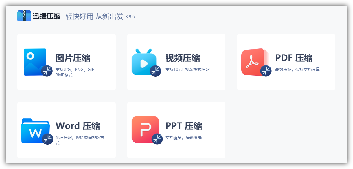除了删掉一些不需要的文件外,还有很多体积较大的重要文件,我们可以借助迅捷压缩软件,将图片、视频、Word、PPT、PDF进行批量无损压缩。