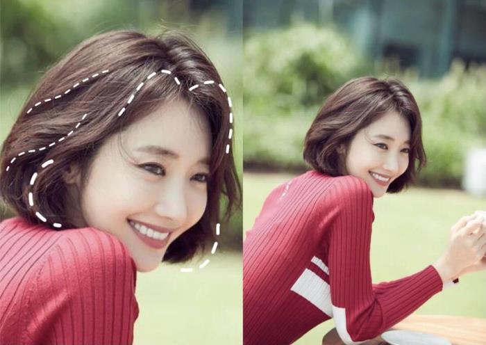 长度在下巴左右,脸蛋两侧往外翻,发尾内扣,缩短脸部长度,更显甜美可爱。刘海为三七分,轻松优化头身比,更显身材高挑。