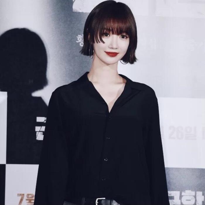 短发长度及腮,露出脖颈线条更显身材高挑,发尾微微外翻,加上稍微有点厚度的齐刘海修饰,很好地修饰了脸型。