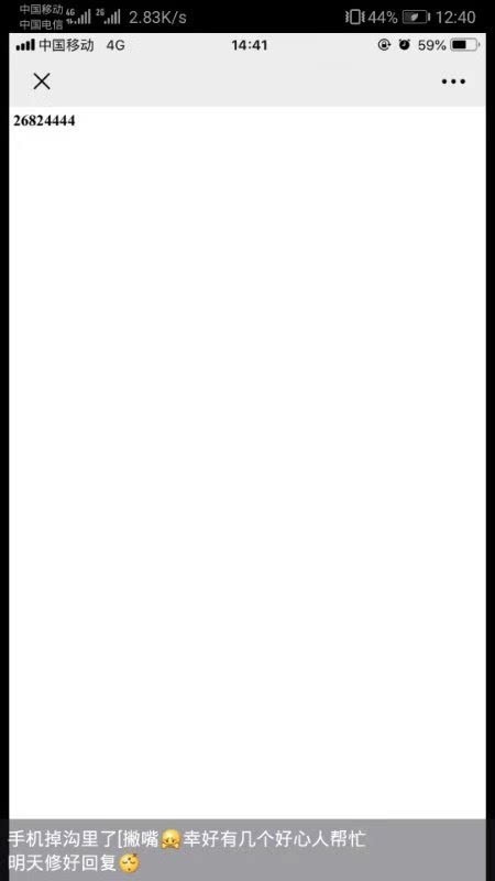 当日21时许,彭雯在朋友圈里更新了一条状态。她在文案中写道,“手机掉沟里了,幸好有几个好心人帮忙,明天修复。”并配发一张白底黑字的图片,上面仅写有一串数字,“26824444”。