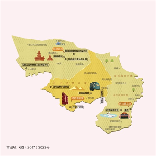 “阿拉善”是贺兰山的音转,贺兰山名源于在此住牧的匈奴贺兰部,阿拉善因贺兰山而得名。在贺兰山、曼德拉山、龙首山等有数以万计的古代岩画,阿拉善被誉为“岩画之乡”。此外,还有“奇石之都”“骆驼之乡”等美誉。境内有额济纳胡杨林、阿拉善沙漠、巴丹吉林沙漠等风景名胜。