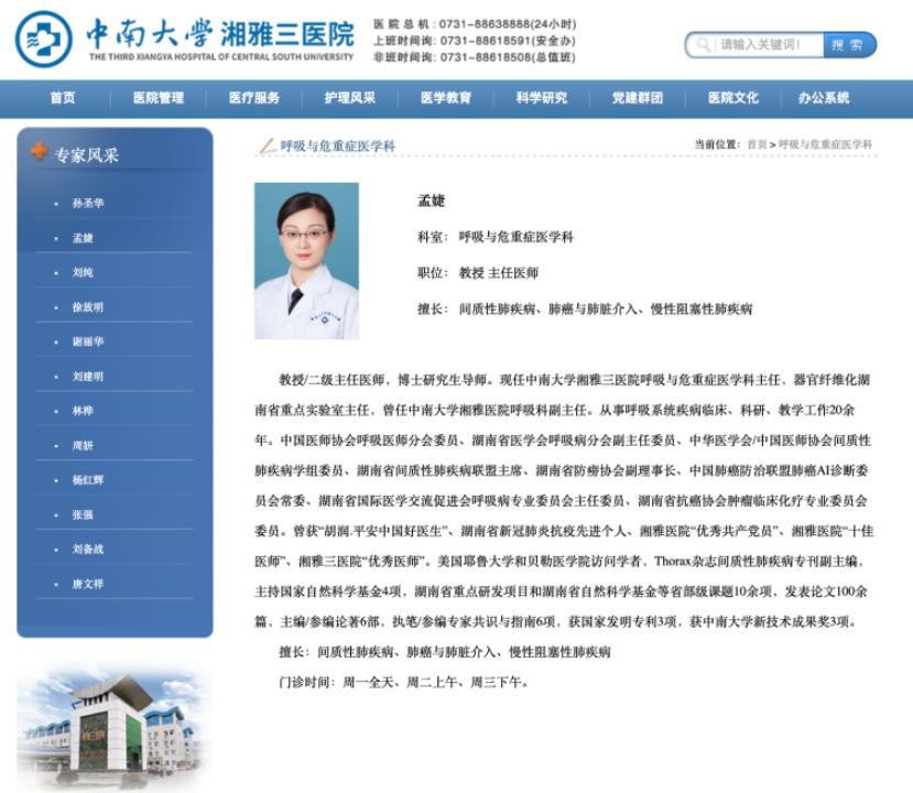 据悉,孟婕现任中南大学湘雅三医院呼吸与危重症医学科主任,器官纤维化湖南省重点实验室主任,曾任中南大学湘雅医院呼吸科副主任。从事呼吸系统疾病临床、科研、教学工作20余年。曾获“胡润·平安中国好医生”、湖南省新冠肺炎抗疫先进个人、湘雅医院“优秀共产党员”、湘雅医院“十佳医师”、湘雅三医院“优秀医师”。