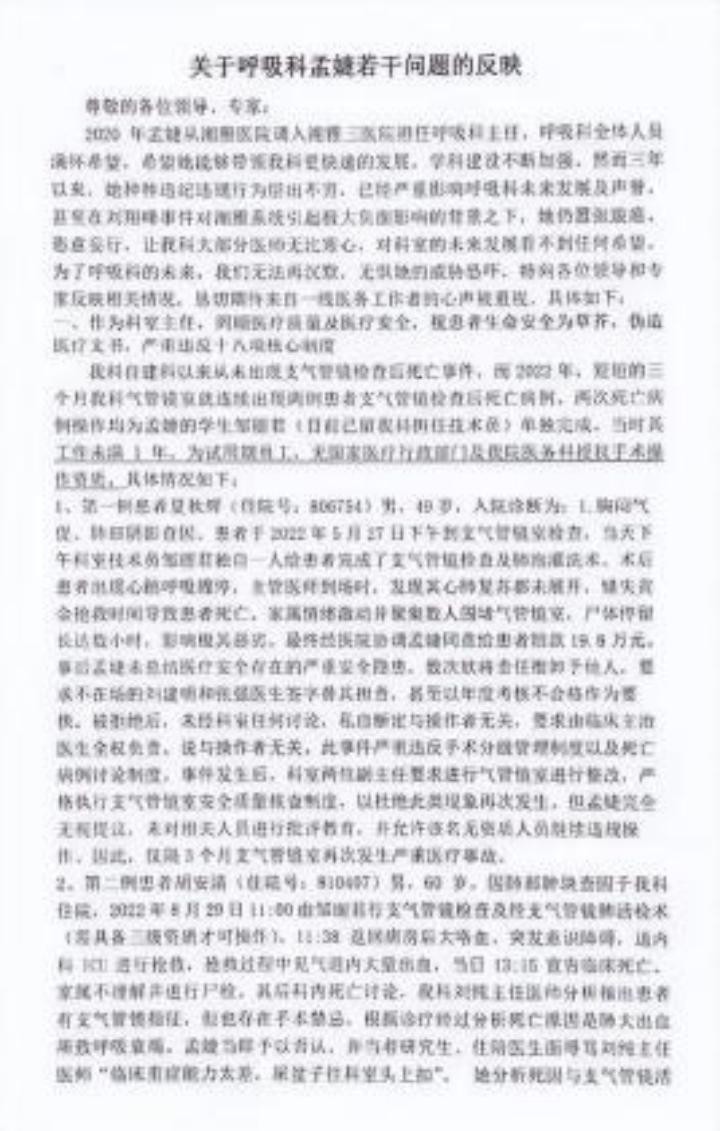 在长达5页的举报信中,举报者反映,孟婕罔顾医疗质量和安全,“放任”其无手术操作资质学生邹某单独进行支气管镜检查,导致三个月内发生2例患者死亡事件,事发后孟婕伪造医疗文书,要求其他医生签字担责。此外,举报者还列举了孟婕“暗箱操作”绩效分配、私设小金库、财务不公开、打压排挤同事等问题。