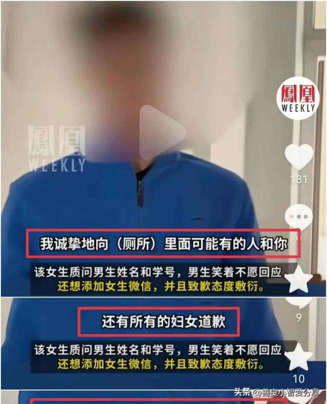 更加令人震惊的是,在被女生揭穿偷拍行为后,该男子竟然厚颜无耻地向女生提出加微信的请求。这一行为立即遭到了女生的怒斥和拒绝,女生要求男子向厕所内所有人和所有妇女道歉,并保证以后不再做这样的事情。然而,男子的道歉似乎并不诚恳,其言行举止仍然令人感到不满和愤怒。