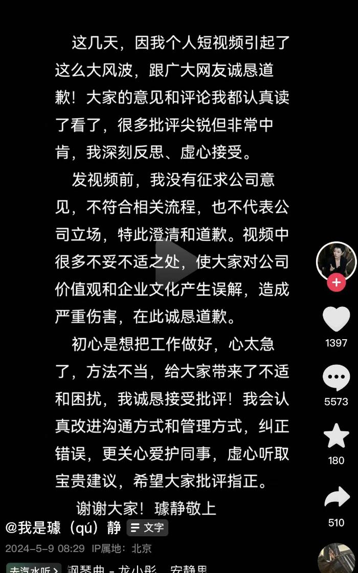 璩静称," 发布短视频之前,我没有事先征求公司意见,不符合相关流程,也不代表公司立场,特此澄清和道歉。视频中很多不妥不适之处,使外部对公司价值观和企业文化产生误解,造成了严重伤害,也在此诚恳道歉 "。璩静表示,发短视频的初心是想把工作做好,但心太急了,方法不当,给大家带来了不适和困扰,诚恳接受各种批评。未来将认真改进个人的沟通方式和管理方式,纠正错误,更关心同事。