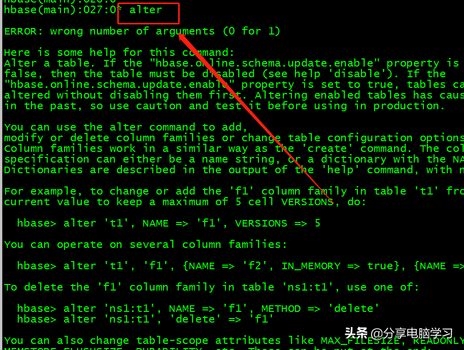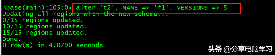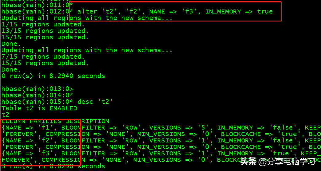 alter t2, NAME => f1, VERSIONS => 5(版本可以不要)