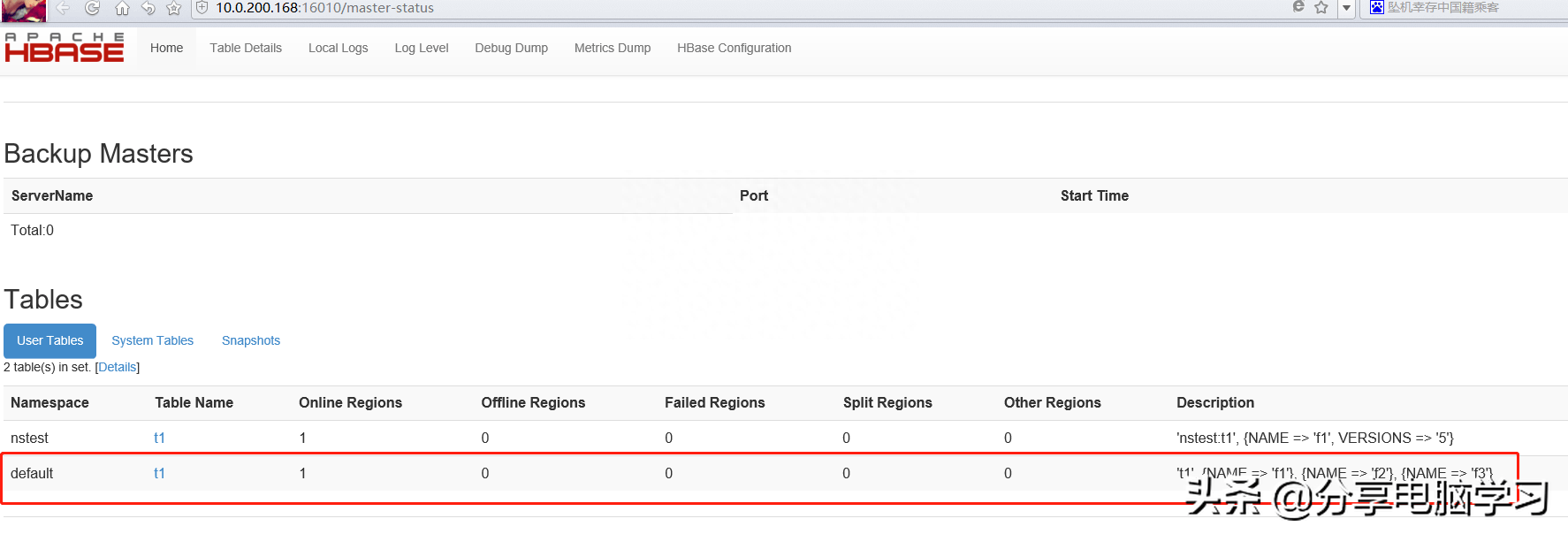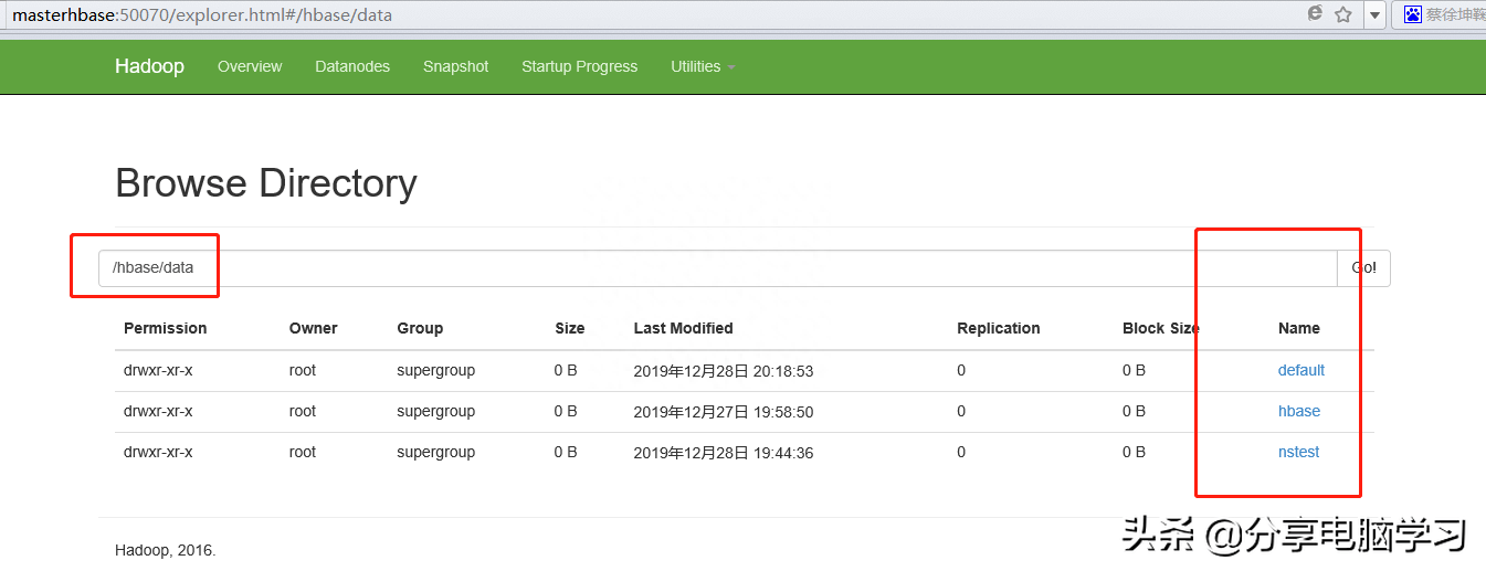 查看50070:hbase用来存放所有hbase的信息的,了解data目录,存放的就是namespace目录
