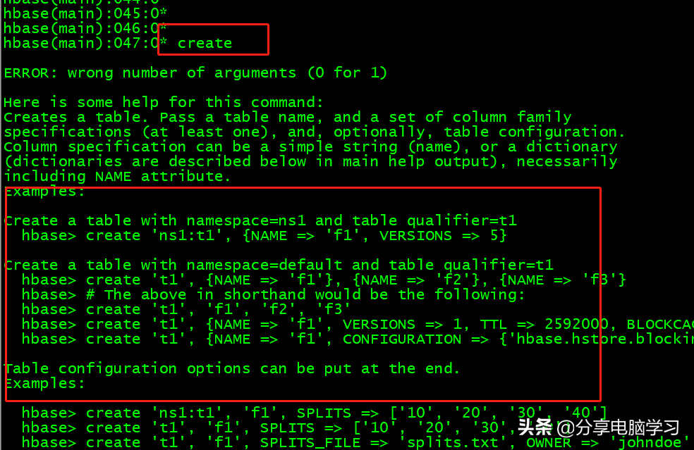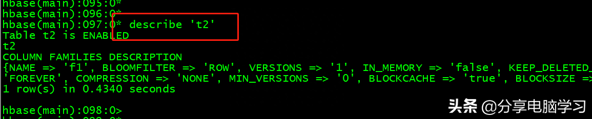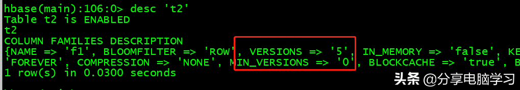 显示所有列簇的信息,每个{}里的参数可以不一样的,以{}进行区分,默认的版本号是1,早期的是3个