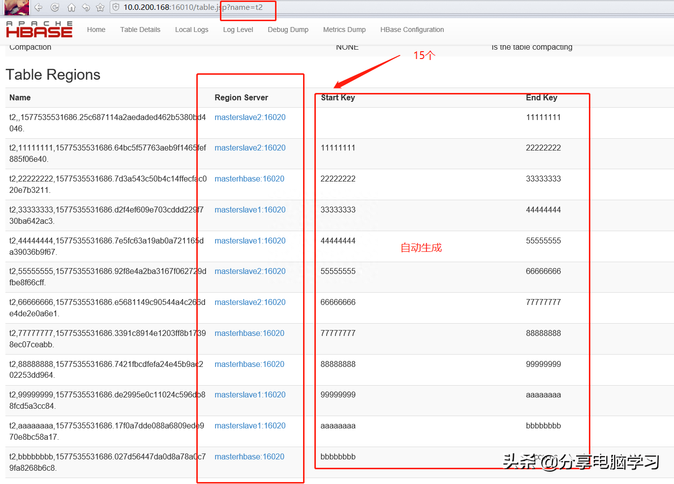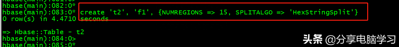 create t2, f1, {NUMREGIONS => 15, SPLITALGO => HexStringSplit}