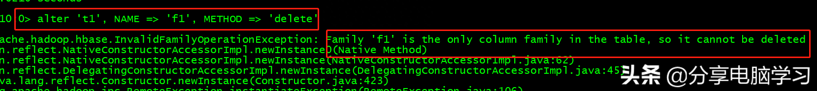ERROR: org.apache.hadoop.hbase.InvalidFamilyOperationException: Family f1 is the only column family in the table, so it cannot be deleted