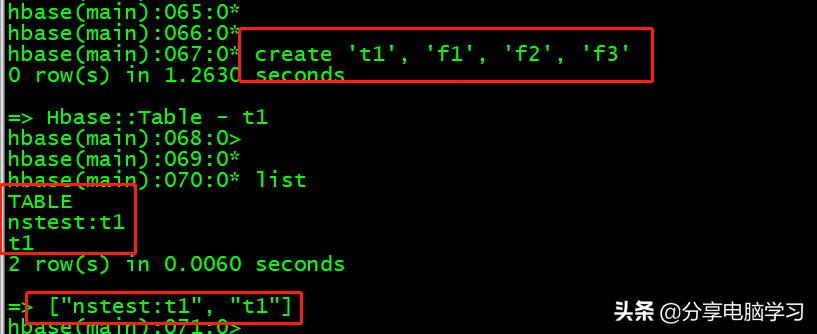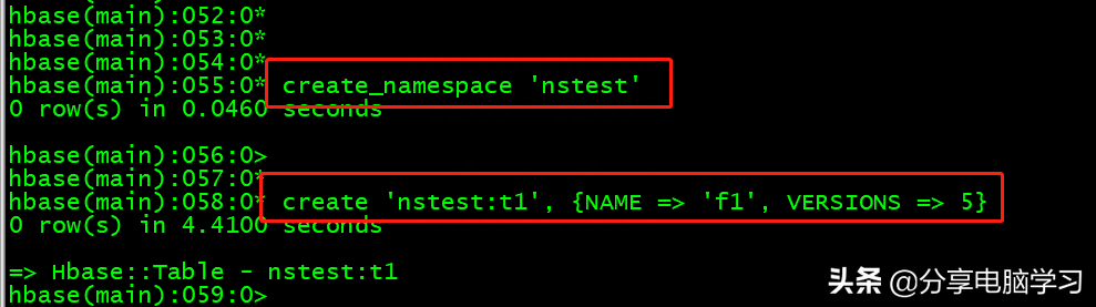 create ns1:t1, {NAME => f1, VERSIONS => 5}