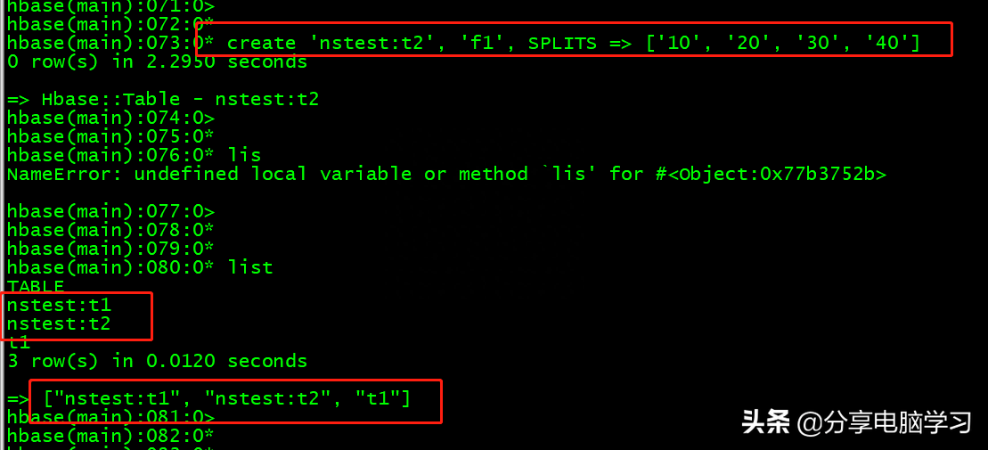 create nstest:t2, f1, SPLITS => [10, 20, 30, 40]